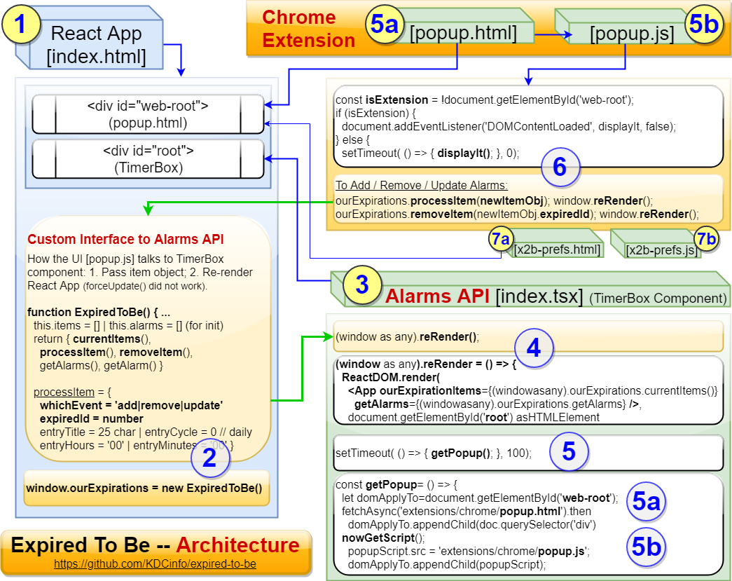 Visual Overview: A detailed schematic outlining the integration between the React ‘Alarms’ component and Chrome browser extension can be found on GitHub: Expired To Be Page Load Architecture Diagram.